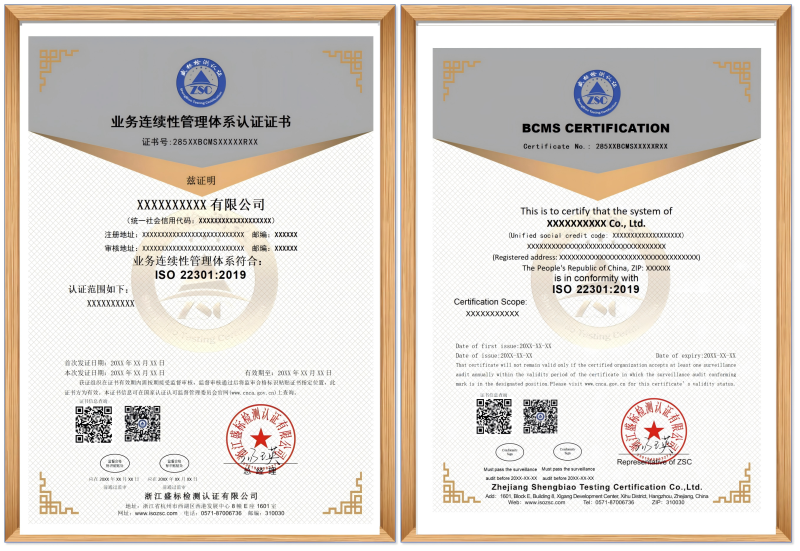 ISO 22301:2019 業(yè)務(wù)連續性管理體系認證證書(shū)樣本: