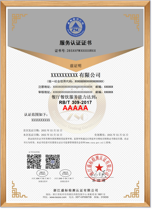 RB/T 309-2017 餐廳餐飲服務(wù)認證證書(shū)樣本: