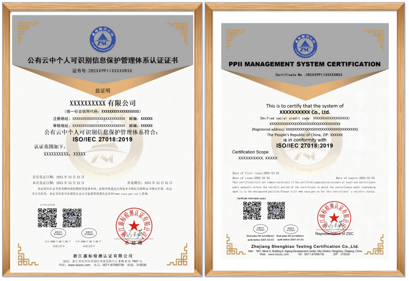 ISO/IEC 27018:2019 公有云中個(gè)人可識別信息保護管理體系認證證書(shū)樣本: