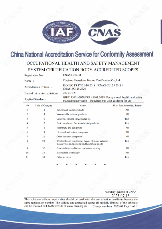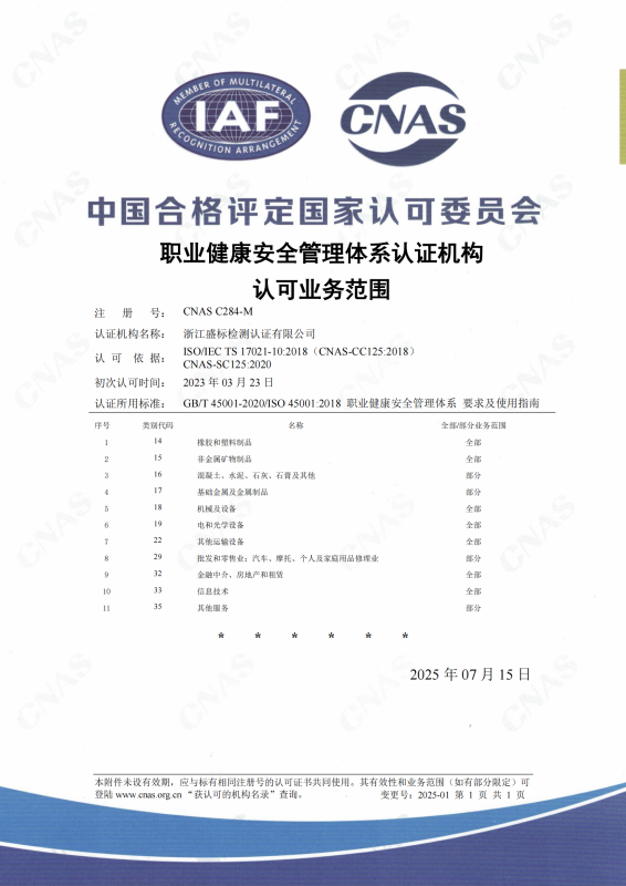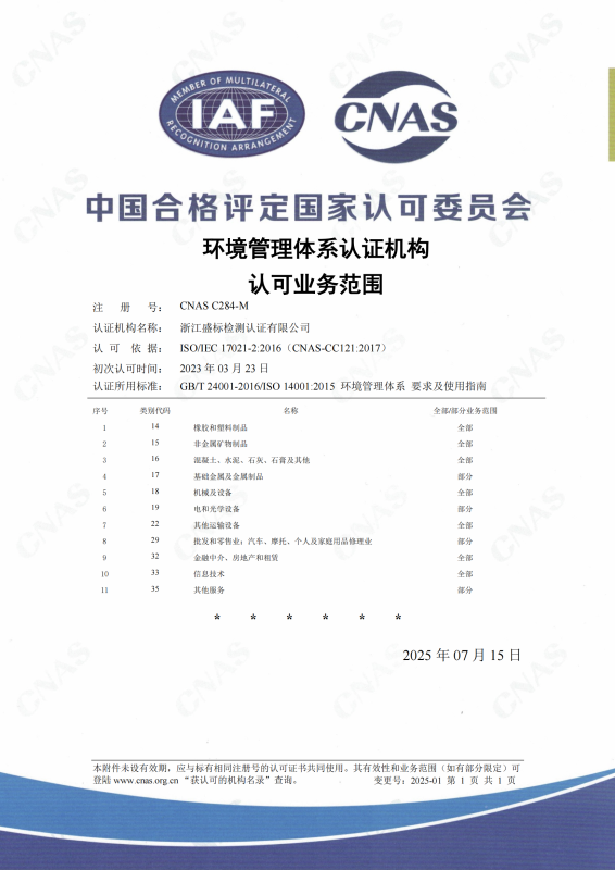 近日,經(jīng)中國合格評定國家認可委員會(huì )(CNAS)嚴格評審,浙江盛標檢測認證有限公司的認證服務(wù)范圍再獲突破,新增23個(gè)認可大類(lèi)!這標志著(zhù)公司在質(zhì)量管理體系(QMS)、環(huán)境管理體系(EMS)、職業(yè)健康安全管理體系(OHSMS)等領(lǐng)域的認證能力進(jìn)一步提升,能夠為更多行業(yè)客戶(hù)提供更專(zhuān)業(yè)、更權威的認證服務(wù)。
